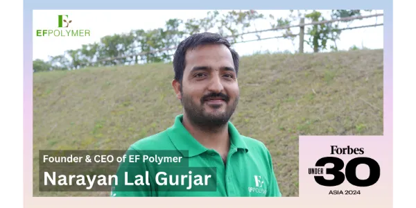 Okinawa, Japan — EF Polymer, a developer of 100% organic superabsorbent polymers, today that its founder and CEO, Narayan Lal Gurjar, has been named to the Forbes Under 30 Asia 2024 list. Hands, Ankit Jain, co-founder and Chief Business Development Officer (CBDO), have also been honored on this list. This recognition highlights their pioneering efforts in innovative polymer solutions across Asia.