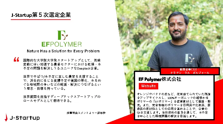 I would like to inform you that EF Polymer Co., Ltd. (Headquarters: Okinawa/ Founder and CEO: Narayan Lal Gharjar, argues “EF Polymer”), which is 100% naturally derived super Absorbent Polymers has been selected for the fifth round of selection for the startup development support program “J-Startup” operated by the Ministry of Economy, Trade and Industry.