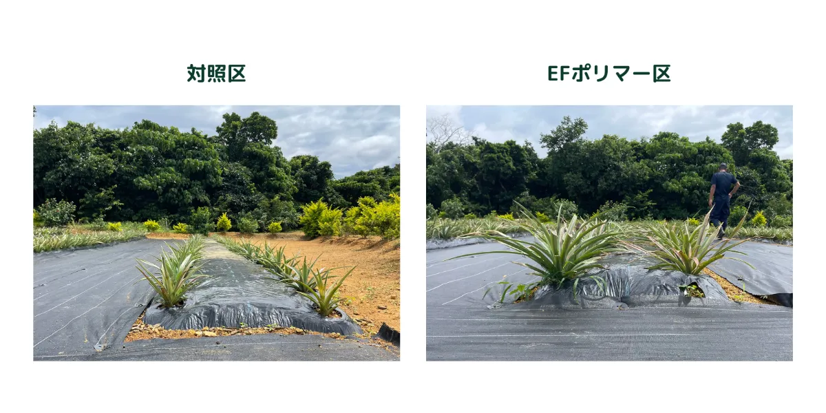EF Polymer recently conducted a demonstration experiment in pineapple cultivation in cooperation with “Chura Sun Farm” in Motobu Town on the main island of Okinawa, and announced the progress along the way. When comparing test areas as a progress analysis where 3 months have passed since planting, there was a big difference in initial growth between the control area and the test area (polymer area) where polymer was mixed with soil.